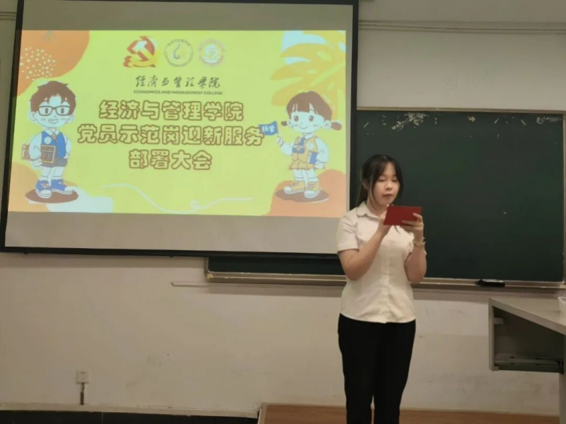为充分发挥学生党员的先锋模范作用,以实际行动践行全心全意为人民服务的宗旨,展现经济与管理学院党组织的先进形象,确保2025级新生迎新工作安全、高效、有序、温暖开展,经济与管理学院于2025年9月8日下午17点20在一教303教室隆重召开了党员示范岗迎新服务工作部署大会。