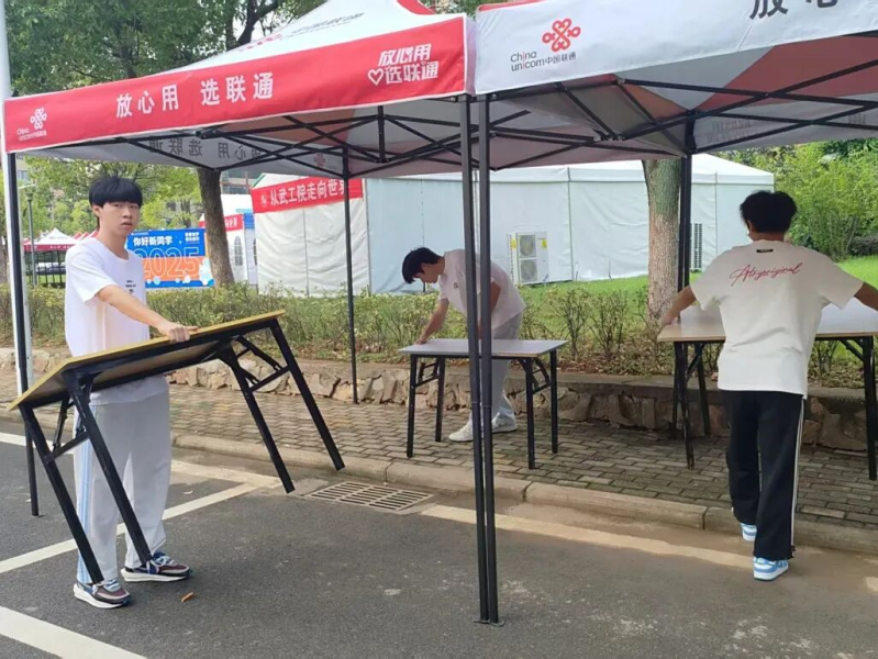 9月9日上午8:30,迎新现场布置工作正式展开。在党员服务中心指导老师田静静和李啸啸的现场指导下,党员志愿者们迅速投入工作。老师们细致指挥摆放流程,志愿者们默契配合,将"学生党员服务中心"标识精心安置,整齐摆放各类迎新物资。医疗保障点的药品准备齐全,清凉消暑物品也一一就位。整个现场布置工作有条不紊,处处体现着细致入微的服务意识,为即将到来的新生营造出温馨周到的迎新环境。