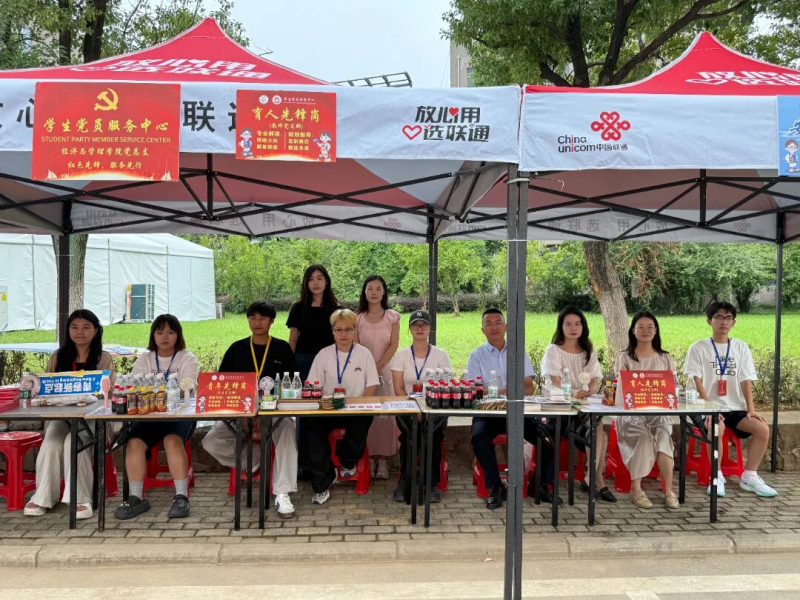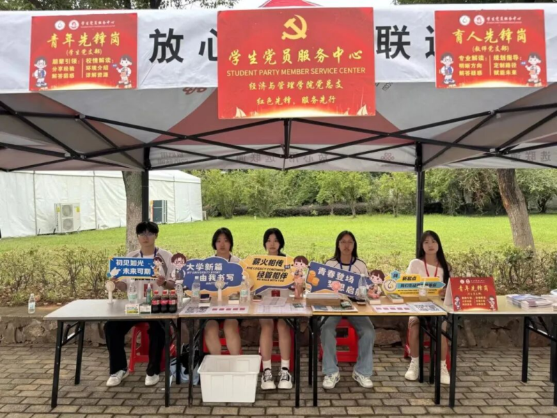 经济与管理学院党员服务中心位于迎新大本营对面,设立青年先锋岗与育人先锋岗,涵盖“安全引导”“夏日送清凉”“医疗保障点”、“行李寄存处”等功能岗位依次排开,为新生提供 “一站式” 贴心引导与帮扶。