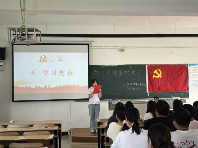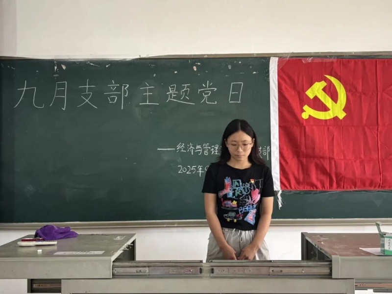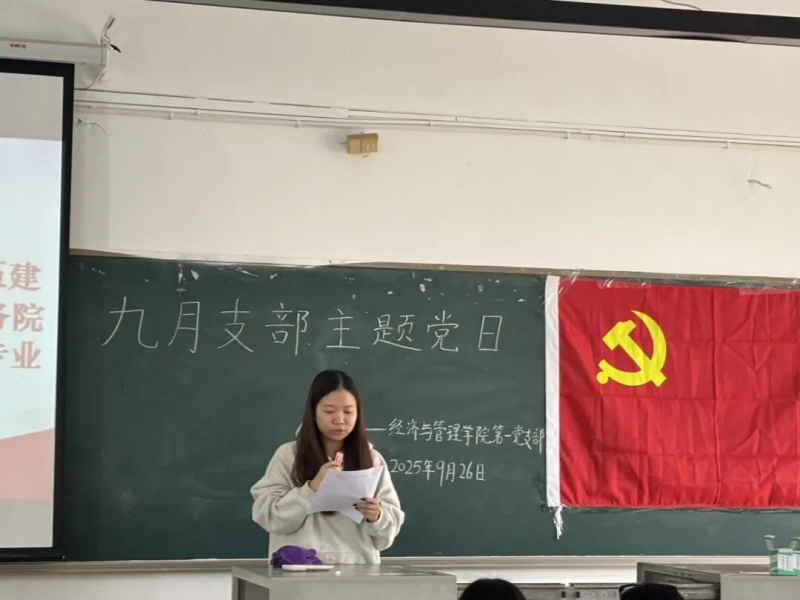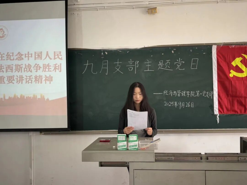 为深入学习习近平新时代中国特色社会主义思想,深刻领会习近平总书记在纪念中国人民抗日战争暨世界反法西斯战争胜利80周年大会上的重要讲话精神。经济与管理学院党总支于2025年9月26日12:15,在一教502教室开展九月支部主题党日活动。