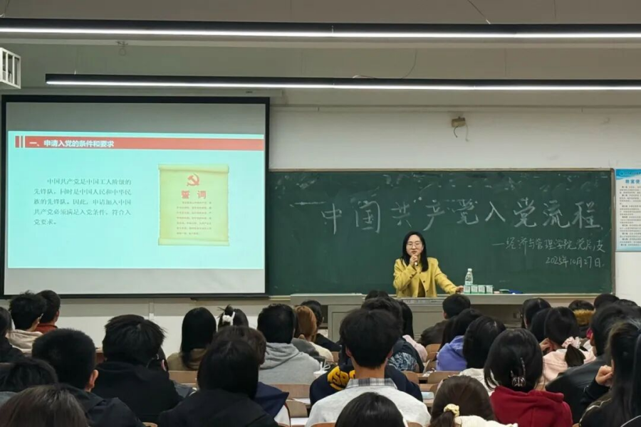 为帮助党校学员系统掌握入党规范、深化对党组织的认知,经济与管理学院于2025年10月27日晚18:00,在一教201开展第四次党课。本次党课以“中国共产党党员入党流程”为主题,由经济与管理学院江梦婷老师主讲,全体党校学员按时参加。