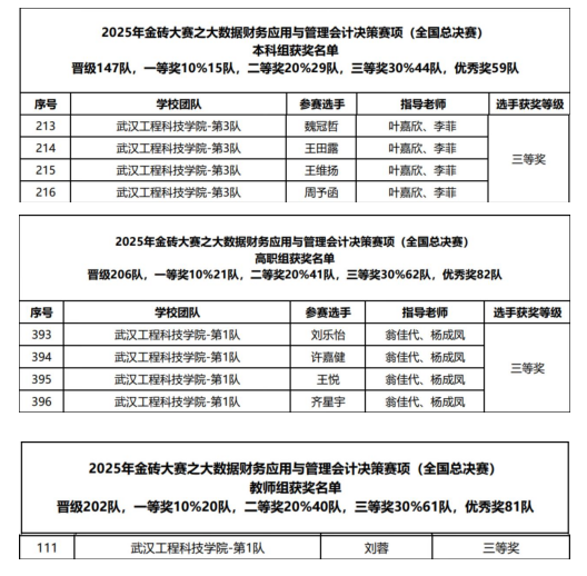 近日,2025 年一带一路暨金砖国家技能发展与技术创新大赛“大数据财务 应用与管理会计决策”赛项全国总决赛圆满落幕。以扎实的理论功底与突出的实操水平,武汉工程科技学院经管学院学子在竞争中展现实力,成功将多项奖项收入囊中。本届国赛捷报频传:本科组(指导教师:叶嘉欣、李菲)与高职组(指导教师:翁佳代、杨成凤)分获三等奖;教师组的刘蓉老师也成功摘得三等奖。在此次全国总决赛中,我校于本科组、高职组、教师组三线告捷,实现了获奖总量的历史性突破。这一里程碑式的佳绩,不仅是对师生拼搏精神的最高褒奖,更是我校财经类专业人才培养体系实力与成效的有力印证。