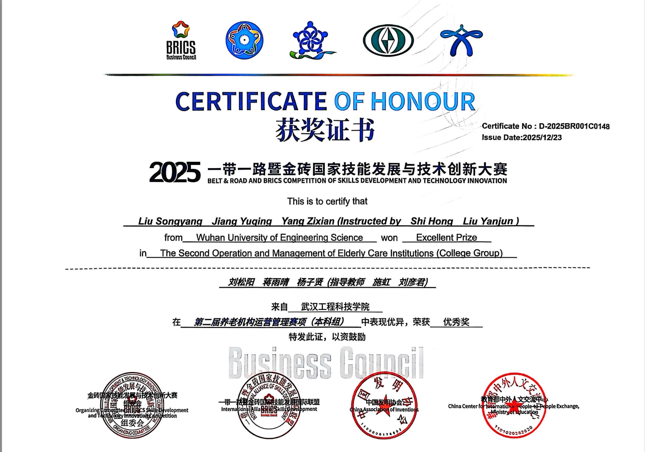 近日,2025一带一路暨金砖国际技能发展与技术创新大赛(第二届养老机构运营管理赛项)国赛在重庆涪陵圆满落幕。经济与管理学院参赛本科组刘松阳、蒋雨晴、杨子贤(指导老师:施虹、刘彦君)荣获国赛优秀奖。一带一路暨金砖国家技能发展与技术创新大赛属于教育部认可的84项全国大学生学科竞赛。