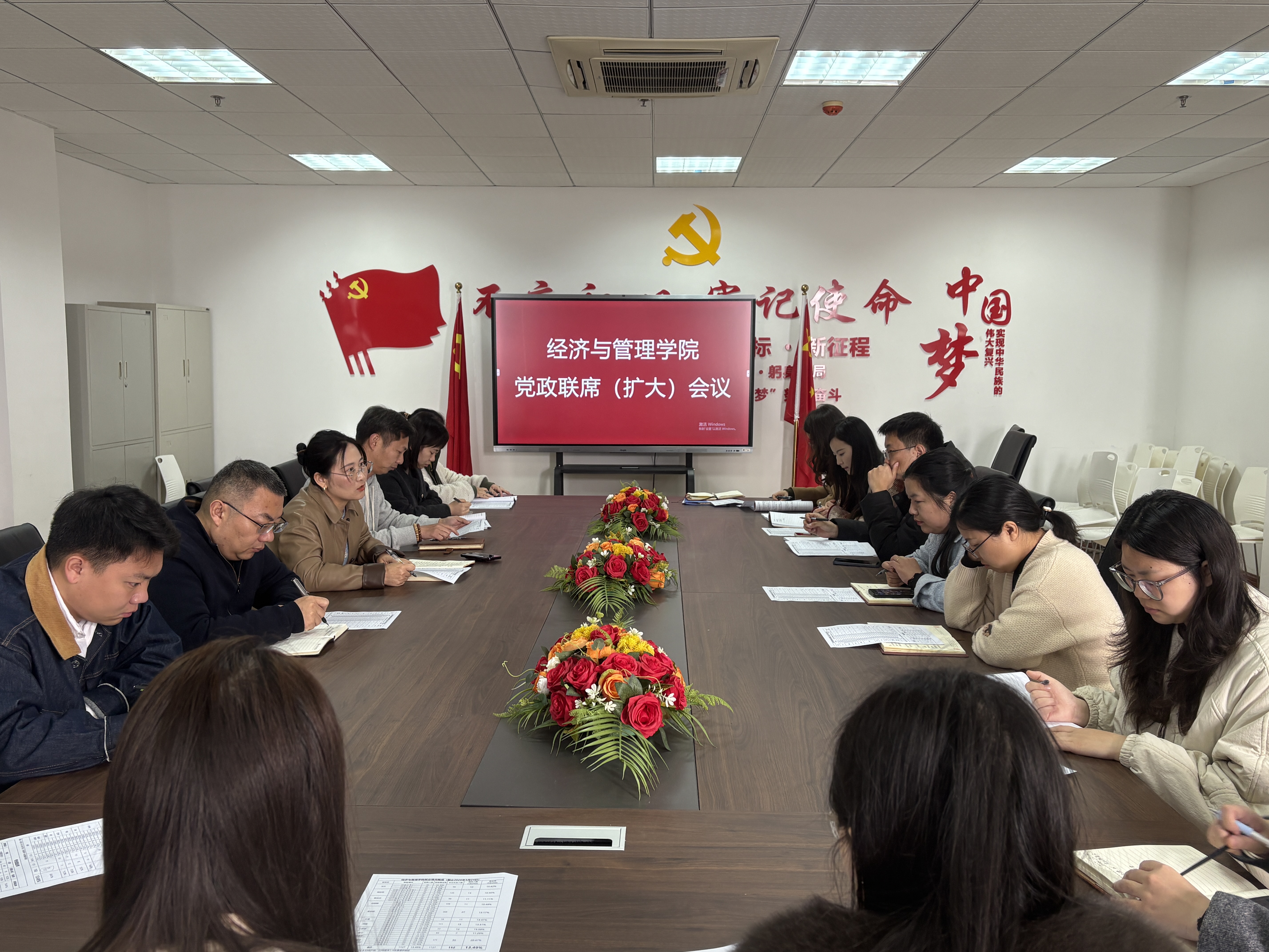 为了进一步促进2026届毕业生就业,提升就业率,2026年3月25日10:00,经管学院在综合楼807会议室召开了党政联席(扩大)会议,研讨落实2026届毕业生就业工作。党总支书记胡美玲主持会议,胡晓峰院长、涂淼副院长、各系主任及所有毕业班辅导员参加会议。